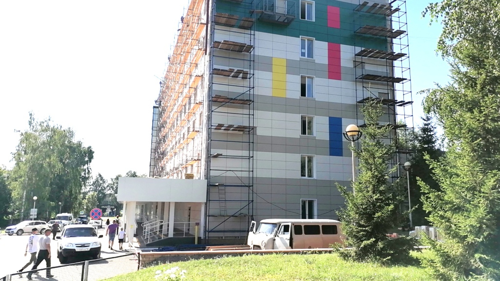 Ремонт фасада детской поликлиники идет полным ходом: здание утепляют пожаробезопасным материалом, а по торцу уже можно судить о дизайнерском решении.