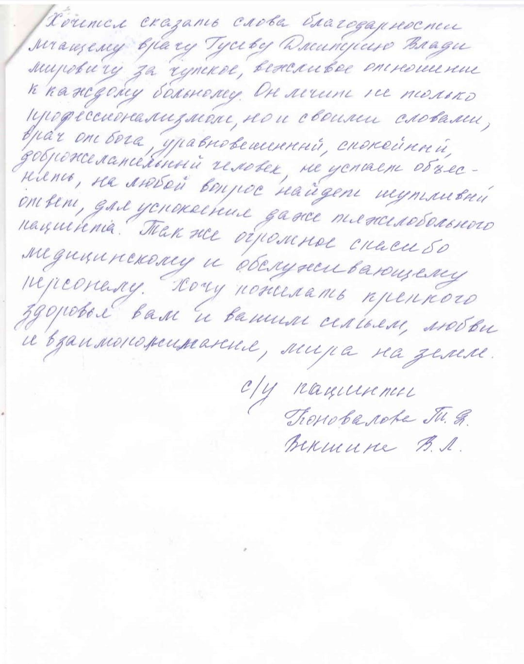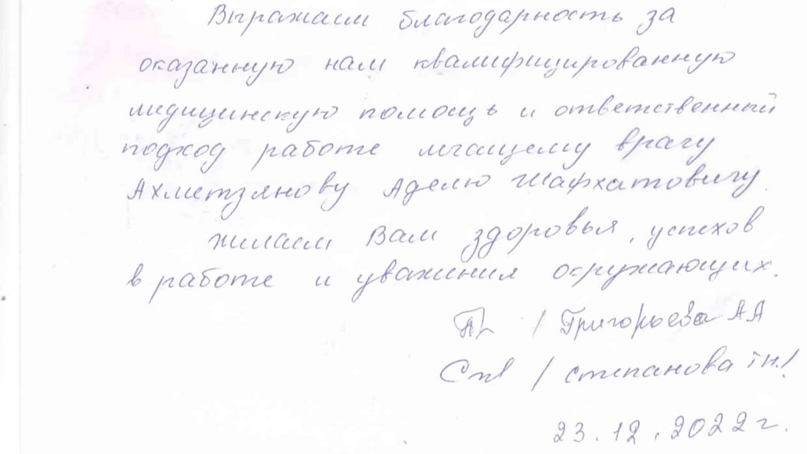 На имя заведующего травматологическим отделением Елабужской ЦРБ Аделя Ахметзянова и врача-травматолога ЕЦРБ Дмитрия Гусева пришли два письма от благодарных пациентов. «Такие отзывы всегда приятно получать. Они окрыляют в дальнейшей работе», - признались адресаты. В своем письме пациенты отметили профессионализм, ответственность и чуткость лечащих врачей. Помимо этого отправители выразили признательность всему медицинскому и обслуживающему персоналу Елабужской ЦРБ.