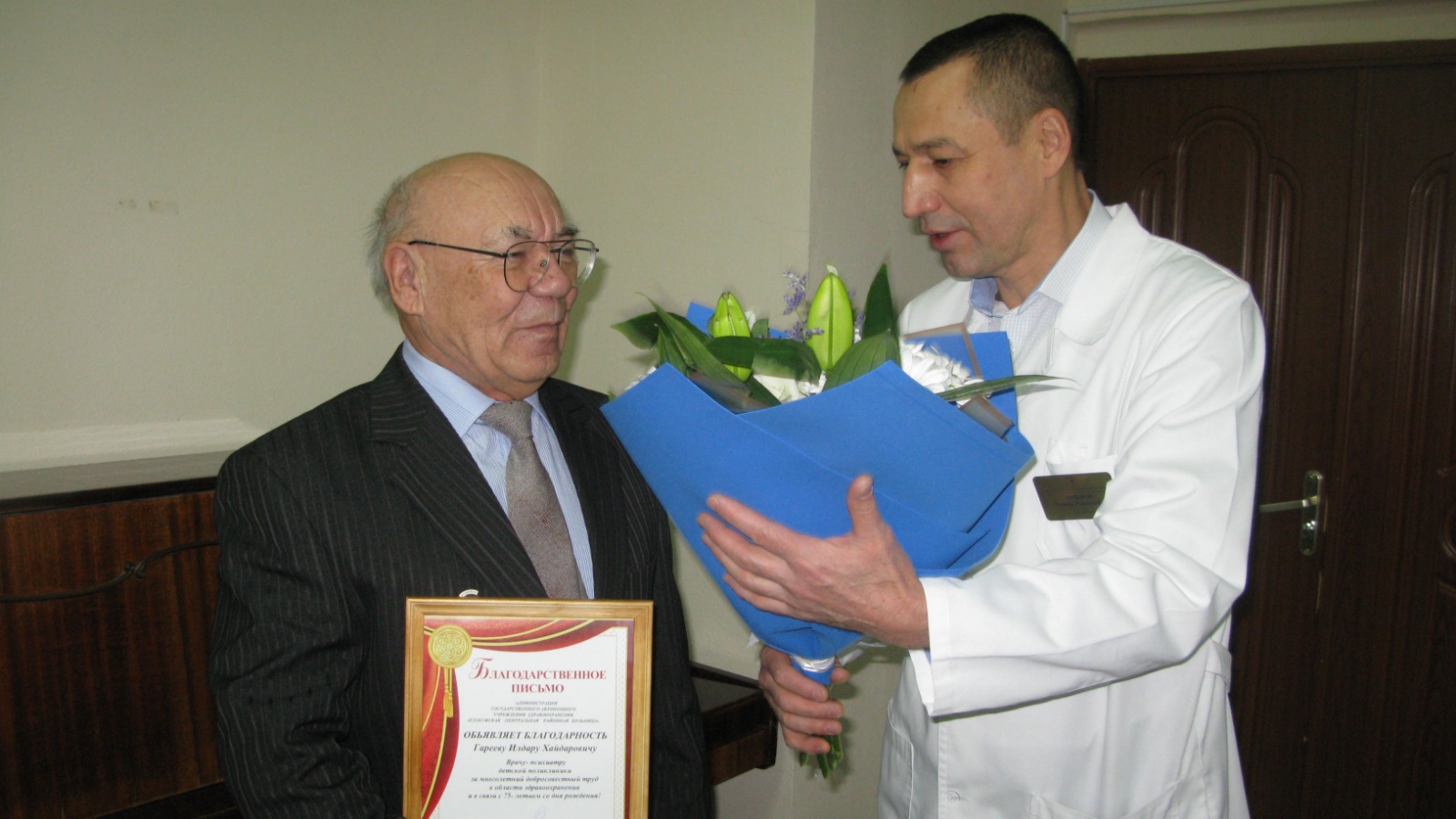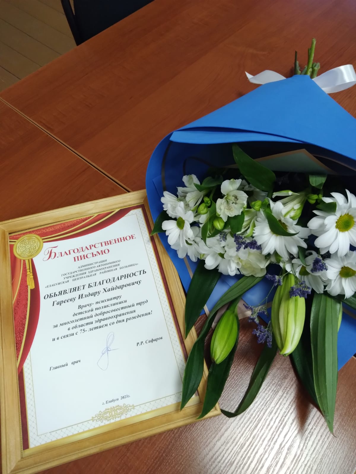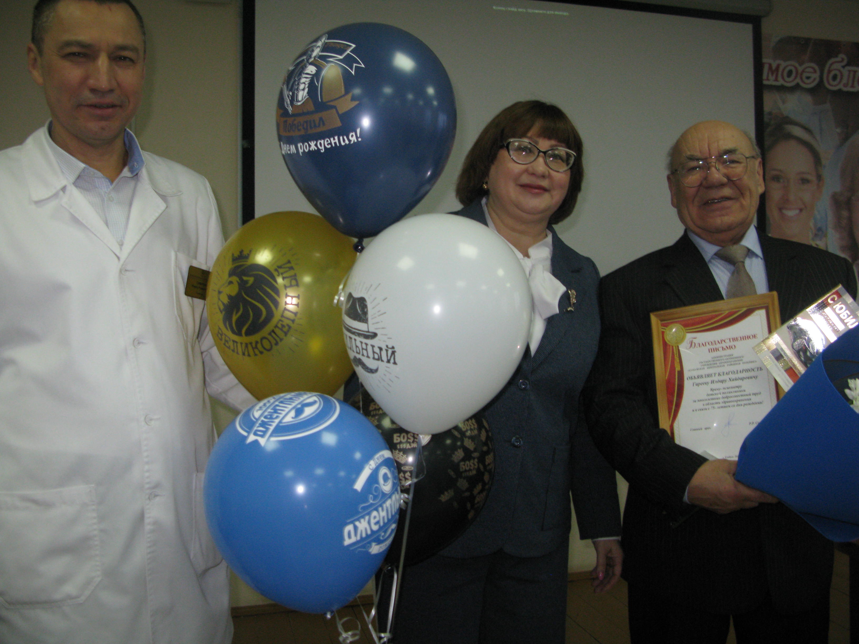 Сегодня во время еженедельной планерки в торжественной обстановке была объявлена благодарность уважаемому и почтенному врачу-психиатру Елабужской ЦРБ Илдару Хайдаровичу Гарееву. В Благодарственном письме сказано: «за многолетний добросовестный труд в области здравоохранения и в связи с 75-тилетним юбилеем (на официальной странице ГАУЗ «ЕЦРБ» в соц. сети об этом уже писали). Весь коллектив и профком ГАУЗ «ЕЦРБ» во главе с Рамилем Сафаровым с теплотой поздравил юбиляра.
