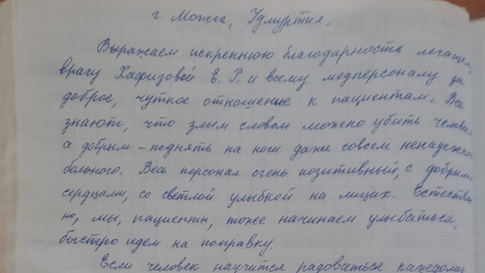 Даже отзывы в стихах оставляют порой благодарные пациенты. Вот, например, одно из таких писем от жительницы из соседней Удмуртии, которая проходила лечение в терапевтическом отделении Елабужской ЦРБ. Она завершила его лирическими строчками.