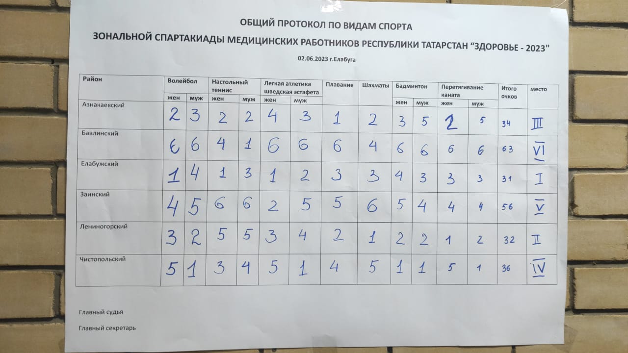 По итогам всех 7- ми этапов Спартакиады Елабужская команда набрала 31 очко. Команда Лениногорска с результатом в 32 очко на 2 месте. Тройку призеров замкнула Азнакаевская ЦРБ. У них 34 очко.