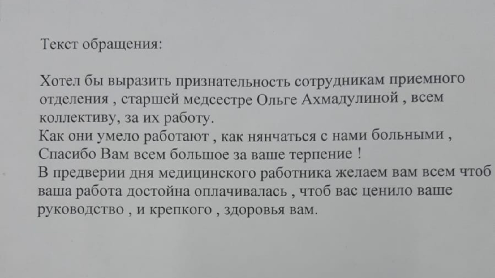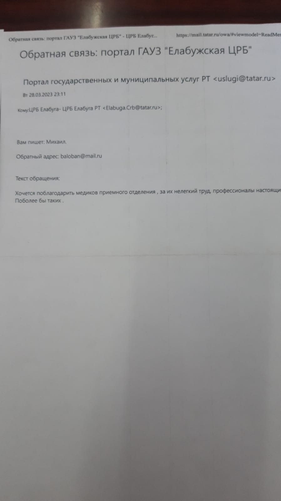 Помимо медперсонала этого отделения 2 письма (только электронных) со словами благодарности получили и сотрудники приемного отделения Елабужской ЦРБ в лице старшей медсестры Ольги Ахмадуллиной. Виртуальные послания были доставлены посредством портала государственных и муниципальных услуг РТ. Но каким бы образом не было получено письмо, медперсонал обоих отделений признает, что такая обратная связь всегда очень важна для них и, конечно же, приятно получать положительную оценку своей работы.
