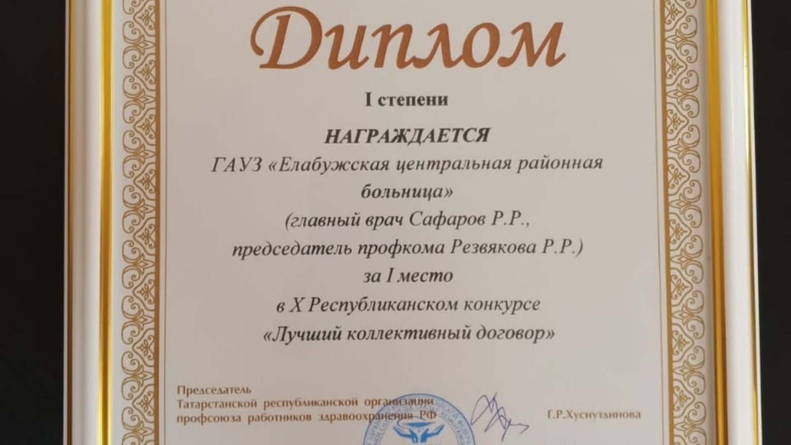Среди татарстанских организаций профсоюзов работников здравоохранения «Лучший коллективный договор» у Елабужской ЦРБ. Профком нашего медучреждения в лице его руководителя Румии Резвяковой занял 1 место на X Республиканском конкурсе. Конкурс проводится ежегодно в июне.