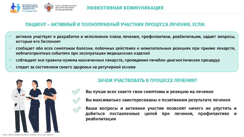 В 2023 г. для Всемирного дня безопасности пациентов выбрана тема «Вовлечение пациентов для обеспечения безопасного оказания медицинской помощи» потому что вклад пациентов, членов их семей и ухаживающих за ними лиц является важнейшим в обеспечении безопасности при оказании медицинской помощи. Зарубежные и отечественные исследования позволяют говорить о том, что партнерские отношения с пациентами при оказании помощи обеспечивают более высокие показатели безопасности и удовлетворенности и формируют целостную качественную систему здравоохранения.