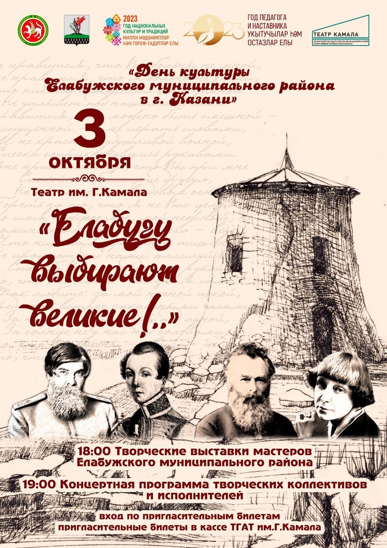 Сегодня в столице нашей республики состоится День культуры Елабужского муниципального района с программой «Елабугу выбирают великие». Мероприятие пройдёт в Татарском государственном академическом театре имени Г.Камала.
