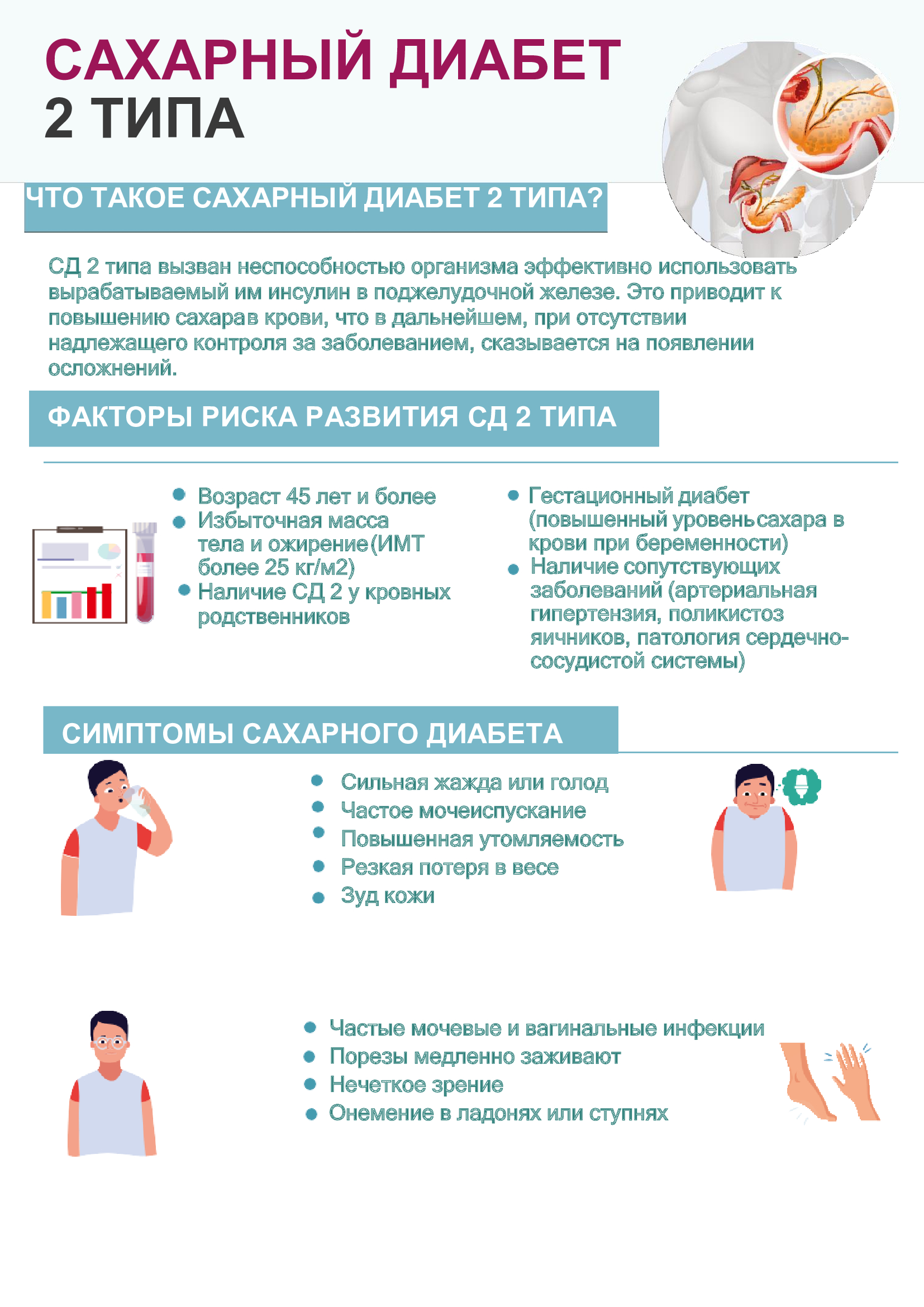 Сахарный диабет – заболевание, которое характеризуется повышенным уровнем глюкозы в крови. Он возникает в результате абсолютного или относительного дефицита инсулина (гормона поджелудочной железы) и может быть как наследственным, так и приобретенным. Этот диагноз не приговор, а повод к самоконтролю.