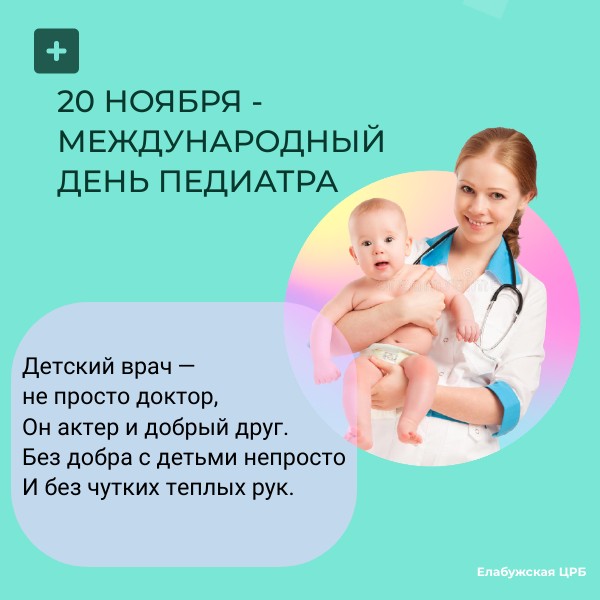 В Елабужской ЦРБ трудится 18 педиатров. Руководство и коллектив поздравляет вас с вашим профессиональным праздником. Лечить людей — одна из самых важных профессий, а лечить детей — это сохранять наше будущее. Желаем вам любви и благополучия в семье, крепкого здоровья. Пусть ваш труд приносит вам удовольствие. С праздником!