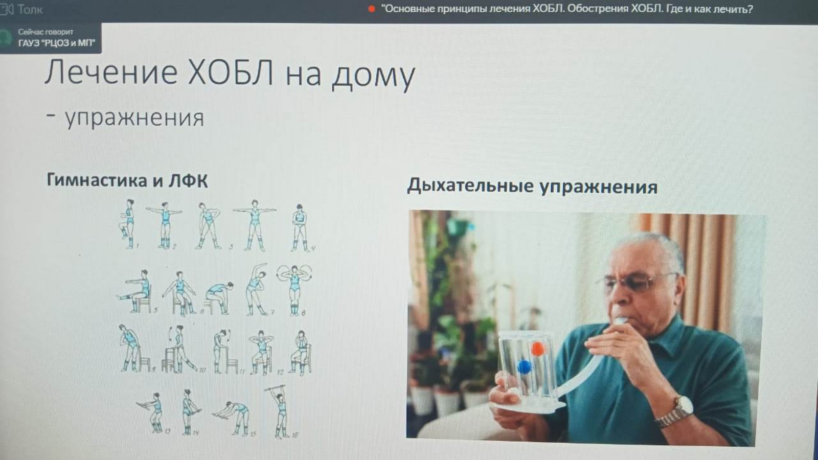 «При лечении ХОБЛ на дому необходимо заниматься гимнастикой – ЛФК, а также делать дыхательные упражнения», – отметил Рустем Шаймуратов.