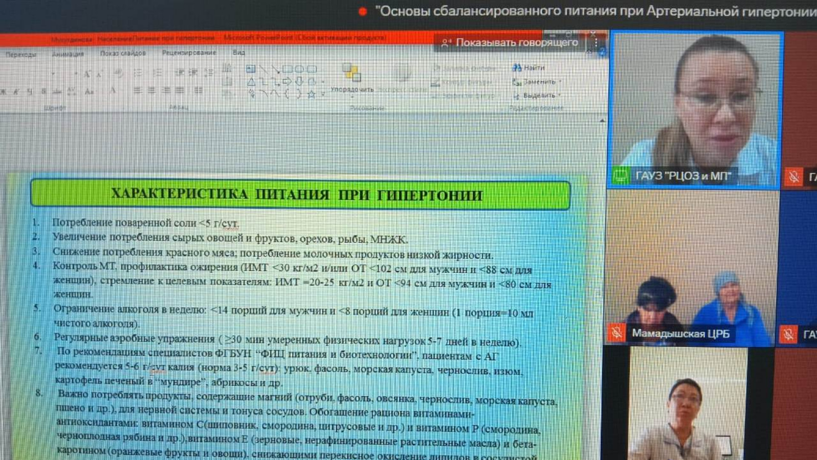 В онлайн формате Гузель Мухутдинова врач по гигиеническому воспитанию Республиканского центра общественного здоровья и медицинской профилактики, нутрициолог рассказала об основах сбалансированного питания при артериальной гипертонии.