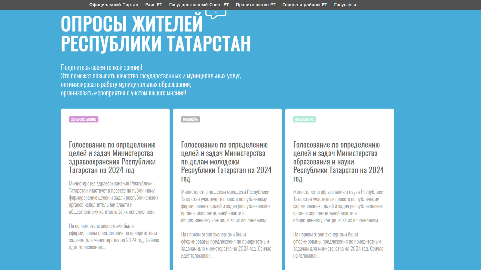 Продолжается голосование по определению публичных целей и задач Министерства здравоохранения Республики Татарстан на 2024 год на сервисе «Опросы жителей» портала Госуслуг РТ https://open.tatarstan.ru/polls/.