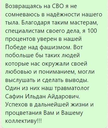 Мобилизованный житель нашего города обратился за травматологической помощью в Елабужскую ЦРБ. Лечение бойца проводил Сафин Ильдан Айдарович - врач-травматолог-ортопед травматологического пункта. Молодой специалист пополнил ряды нашей больницы в начале лета. Со своими обязанностями Ильдан Сафин справился отлично, о чем рассказал благодарный пациент.