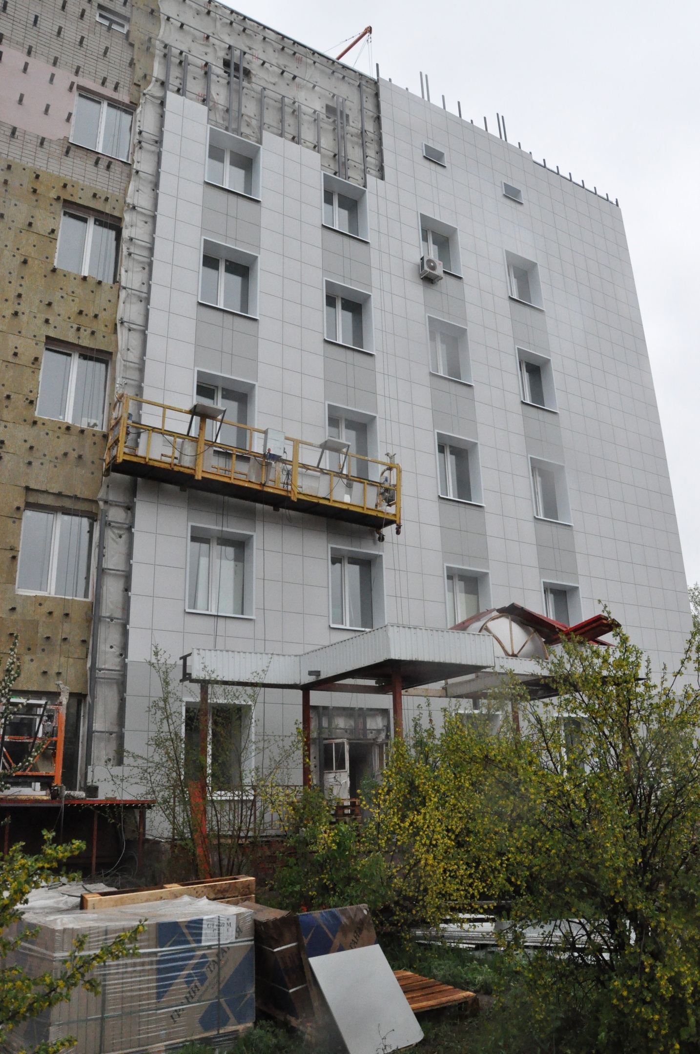 Сейчас в терапевтическом корпусе залили новый пол, на 2,3 этажах начали выкладывать плитку, завершены электромонтажные работы, ремонт кровли, продолжается утепление и обшивка фасада.