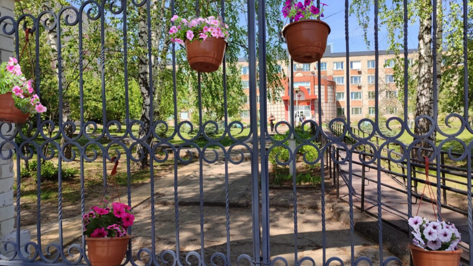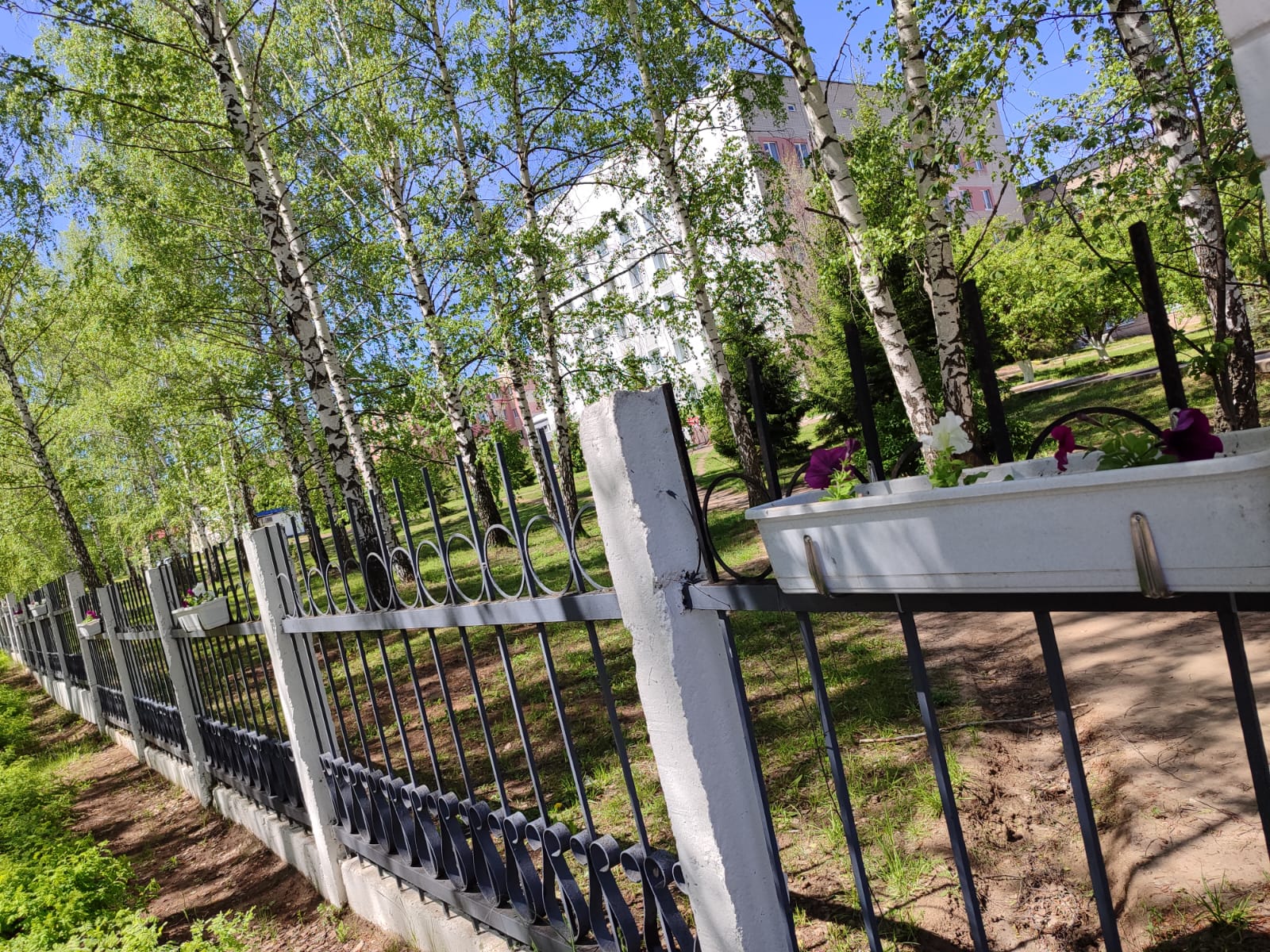Кашпо с цветами появились на воротах центрального входа и вдоль забора проспекту Нефтяников, рядом с деткой поликлиникой и КПП.