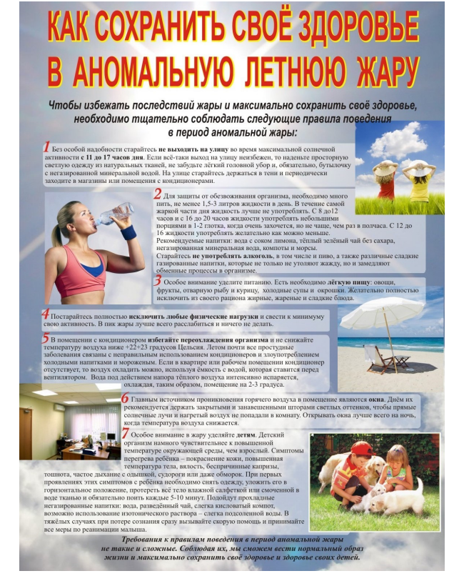 7. Главным источником проникновения горячего воздуха в помещение являются окна. Днём их рекомендуется держать закрытыми и занавешенными шторами светлых оттенков, чтобы прямые солнечные лучи и нагретый воздух не попадали в комнату. Открывать окна лучше всего на ночь, когда температура воздуха снижается. 8. Необходимо знать симптомы теплового и солнечного удара. Это в первую очередь такие признаки, как слабость, вялость, головокружение, сильное потоотделение, жажда, головная боль, тошнота и рвота. В особо тяжёлых случаях возможна потеря сознания. Очень важно суметь вовремя и правильно оказать помощь человеку, который внезапно потерял сознание в душном транспорте или даже посреди улицы. Если человек перегрелся, и у него наблюдаются вышеперечисленные симптомы, незамедлительно вызывайте врача и проводите мероприятия по охлаждению организма. Пострадавшего необходимо уложить в прохладном месте, на голову положить холодный компресс или влажное полотенце. Если пострадавший в сознании, дайте ему обильное питьё, если нет, то приводите его в чувство с помощью нашатырного спирта и ждите приезда бригады скорой помощи! Из всего вышесказанного видно, что требования к правилам поведения в период аномальной жары не такие и сложные. Соблюдая их, мы сможем вести нормальный образ жизни и максимально сохранить здоровье!