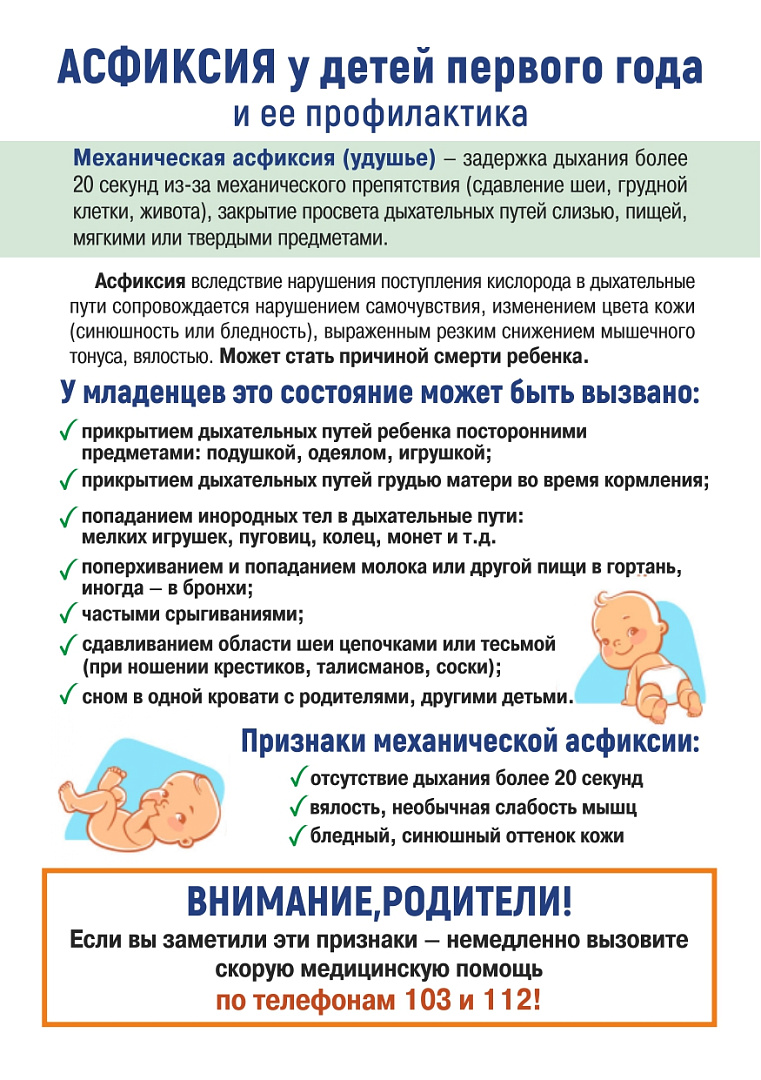 Асфиксия — удушье, вызванное сдавлением дыхательных путей, закрытием их просвета слизью, пищей, сдавлением шеи, грудной клетки и живота, которое может привести к смерти ребенка.