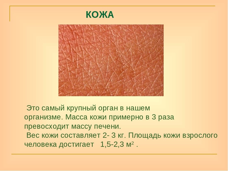 Кожа человека – это один из его органов, имеющий свое строение и физиологию. Кожа является самым большим органом нашего тела, ее масса примерно в три раза превосходит массу печени (самого крупного органа в организме), что составляет 5% от общего веса тела.