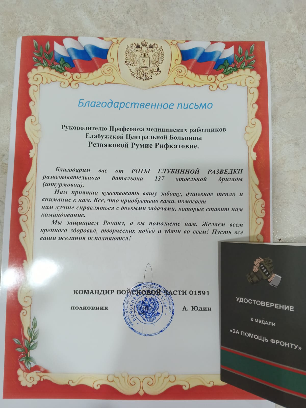 Тем временем рота глубинной разведки разведывательного батальона 137 отдельной бригады наградила руководителя Профсоюзного комитета медицинских работников Елабужской ЦРБ Резвякову Румию Рифкатовну благодарственным письмом. «Нам приятно чувствовать вашу заботу, душевное тепло и внимание к нам. Все, что приобретено вам, помогает нам лучше справляться с боевыми задачами, которые ставит нам командование. Мы защищаем Родину, а вы помогаете нам. Желаем всем крепкого здоровья, творческих побед и удачи во всем! Пусть все ваши желания исполняются!»-сообщается в письме.