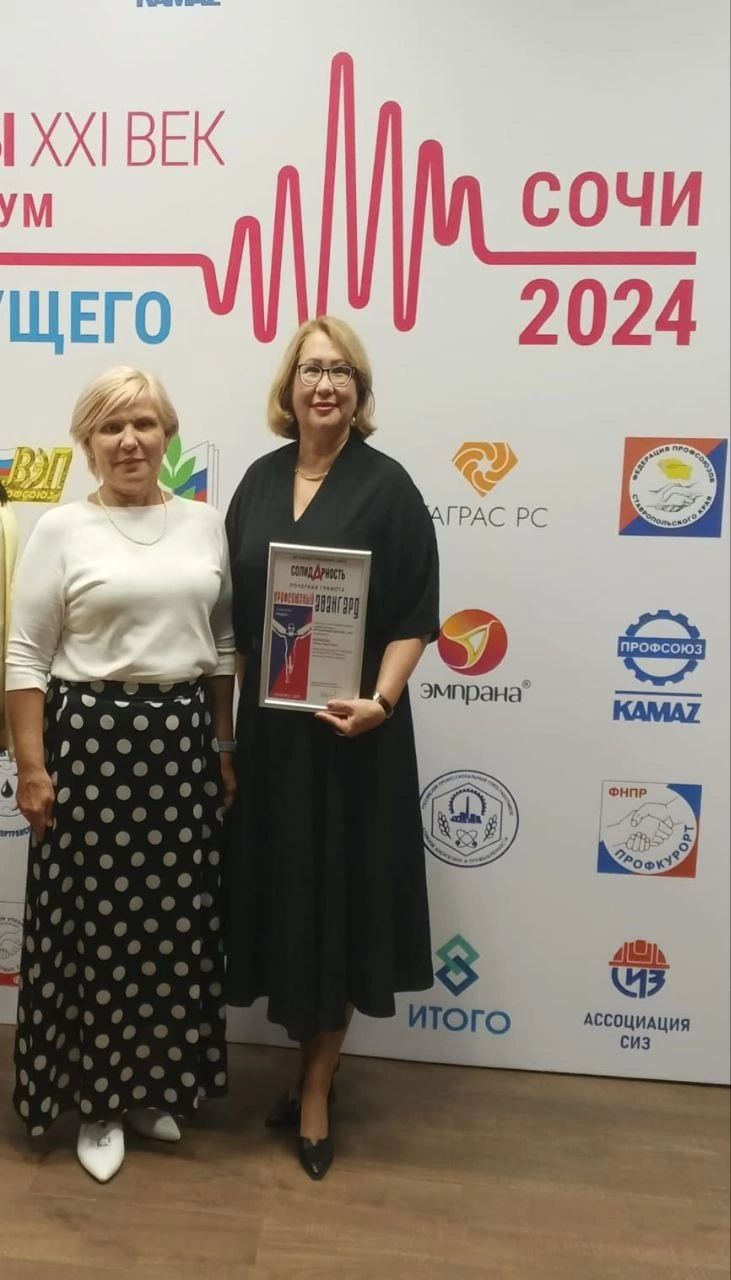 В финале форума прошла церемония награждения лауреатов и призеров конкурсов центральной профсоюзной газеты «Солидарность». Почетной грамотой «Профсоюзный авангард-2024» в номинации «Лидер» удостоена председатель первичной профсоюзной организации Елабужской центральной районной больницы Рамия Резвякова.