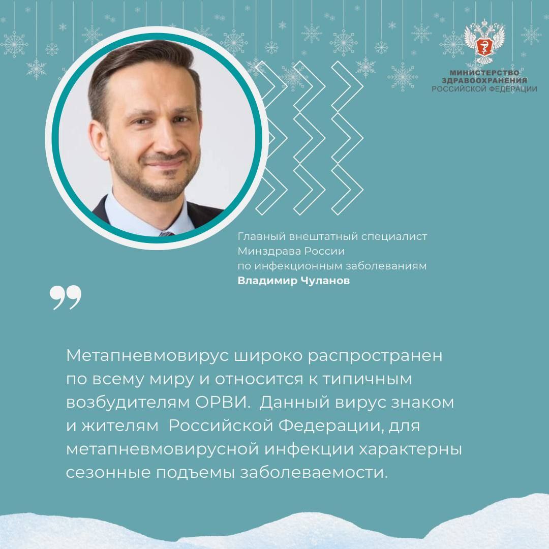 Владимир Чуланов подчеркнул, что у взрослых обычно метапневмовирусная инфекция протекает в легкой форме в виде ОРВИ или бессимптомно. Однако не исключено развитие бронхитов, пневмоний.