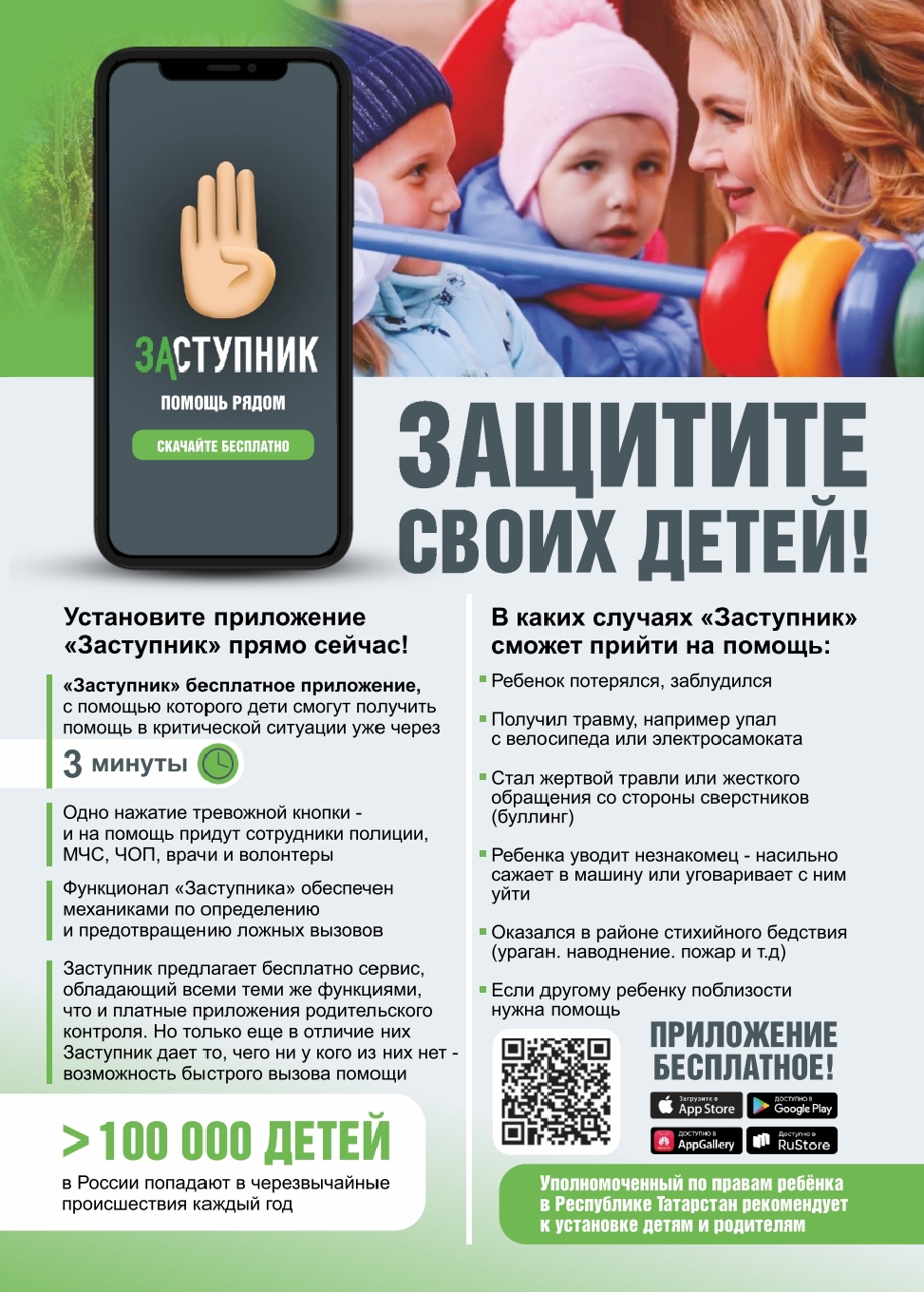 Уважаемые родители! По инициативе Уполномоченного по правам ребѐнка в РТ Ирины Волынец при поддержке Раиса Татарстана Рустама Минниханова в республике запущен проект по содействию детской безопасности «Заступник».