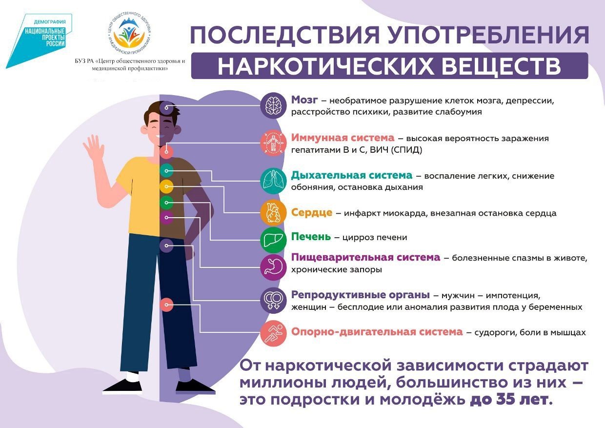 Поскольку все яды в организме обезвреживаются печенью, прием наркотиков вызывает гибель ее клеток и развитие цирроза. А из-за постоянной стимуляции систем организма у наркоманов быстро истощается сердечная мышца, и значительно снижается иммунитет. Кроме того, из-за пользования общими шприцами и частого отсутствия половой гигиены наркоманы нередко заражают друг друга гепатитом В и С, сифилисом и ВИЧ-инфекцией.