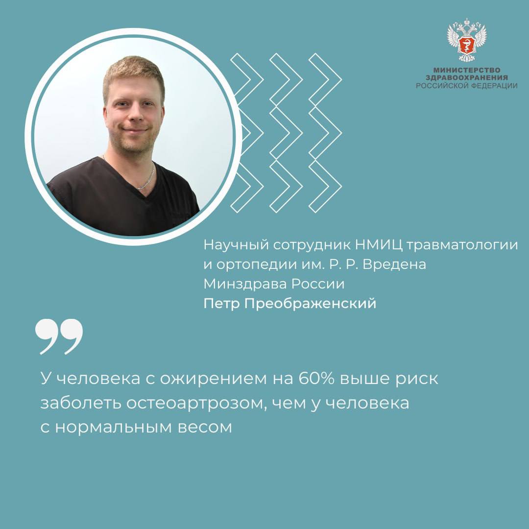 Он подчеркнул, что у человека с ожирением на 60% выше риск заболеть остеоартрозом, чем у человека с нормальным весом.