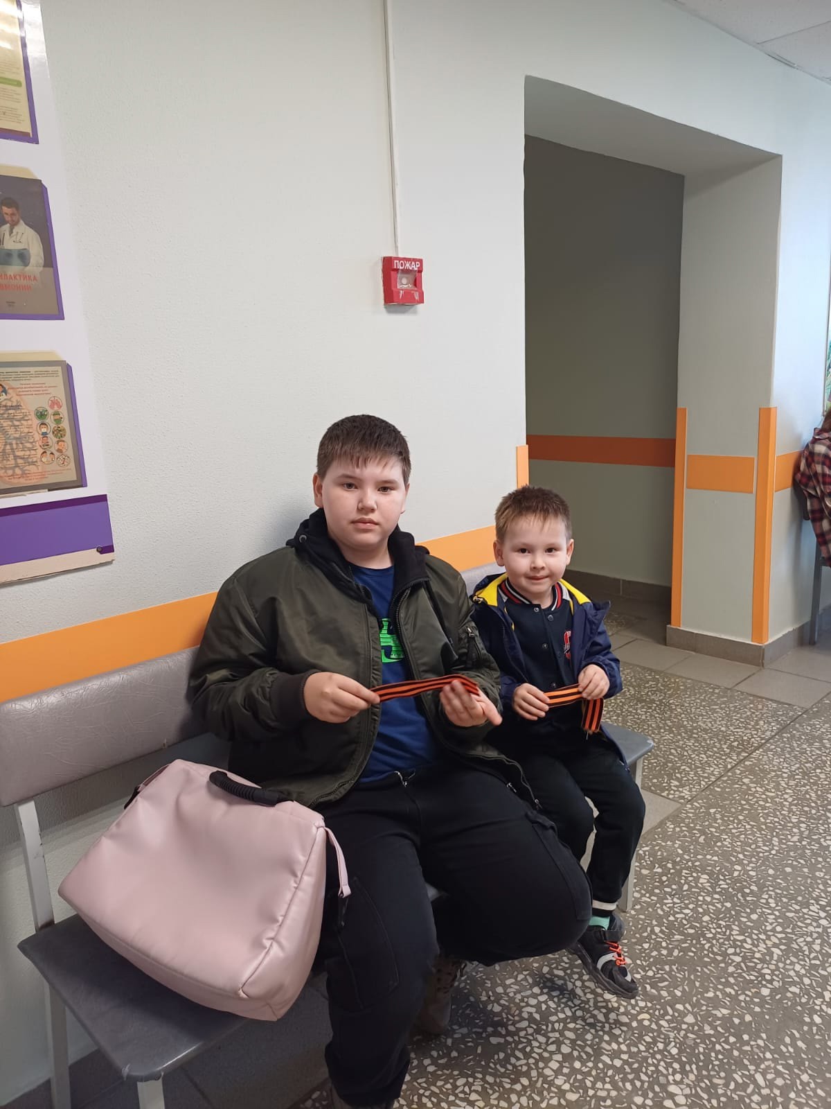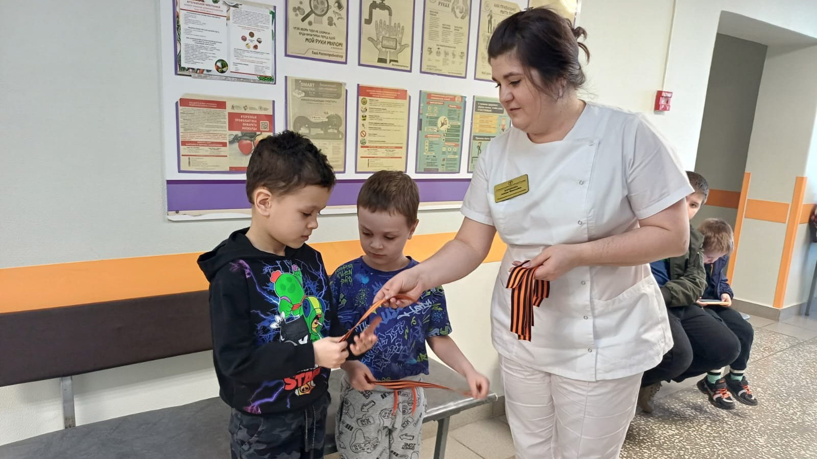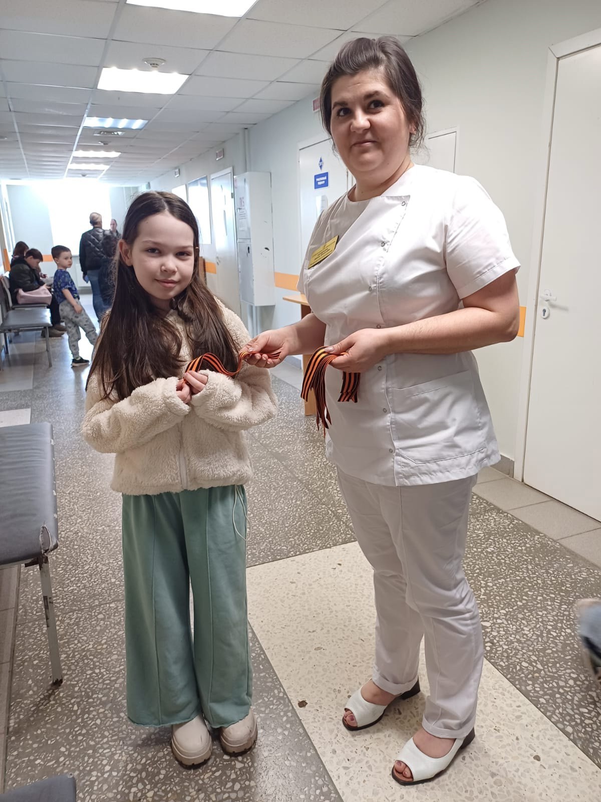 Георгиевские ленты раздавали в детской поликлинике и травматологии, напоминая посетителям о подвиге советского народа.