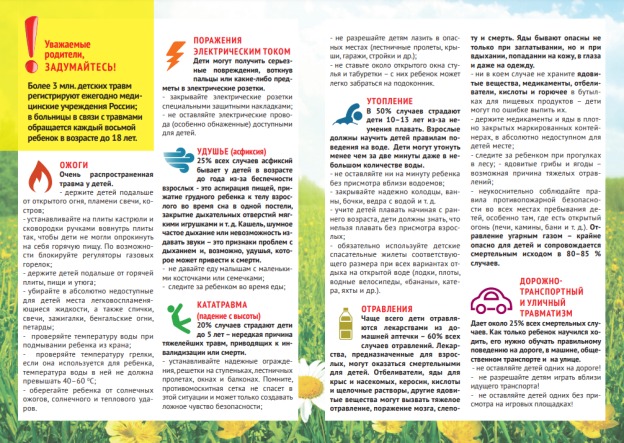 Наиболее распространенные несчастные случаи, приводящие к увечьям и смерти детей: ожоги, падения с высоты (в т.ч. выпадение из окон), утопления, отравления, поражения электрическим током, дорожно-транспортные происшествия, включая происшествия с участием мотоциклистов, велосипедистов, самокатчиков.