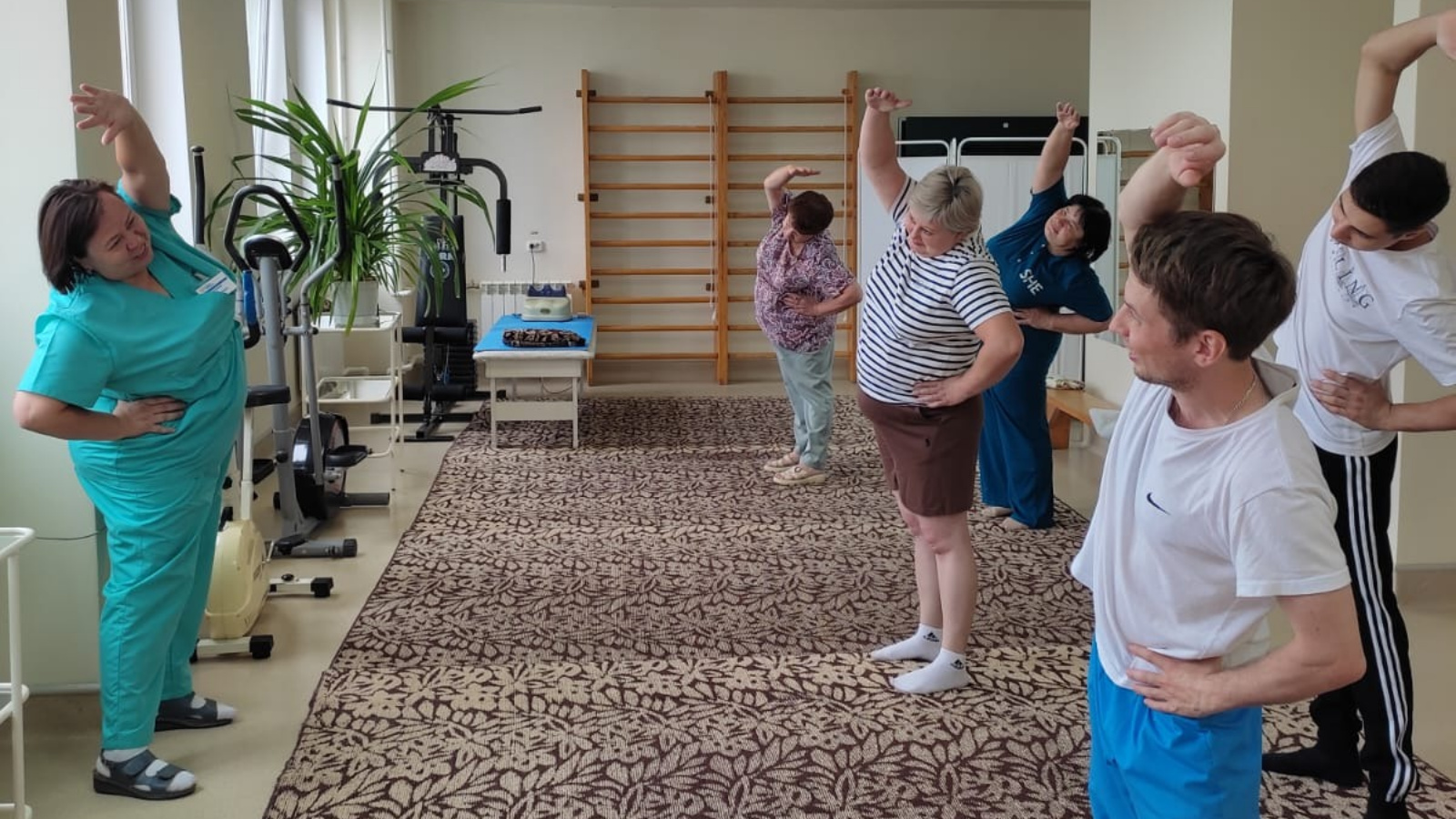 Занятие гимнастикой в зале ЛФК поликлиники собрало вместе и пациентов, и медицинских работников для совместного оздоровления и обучения.