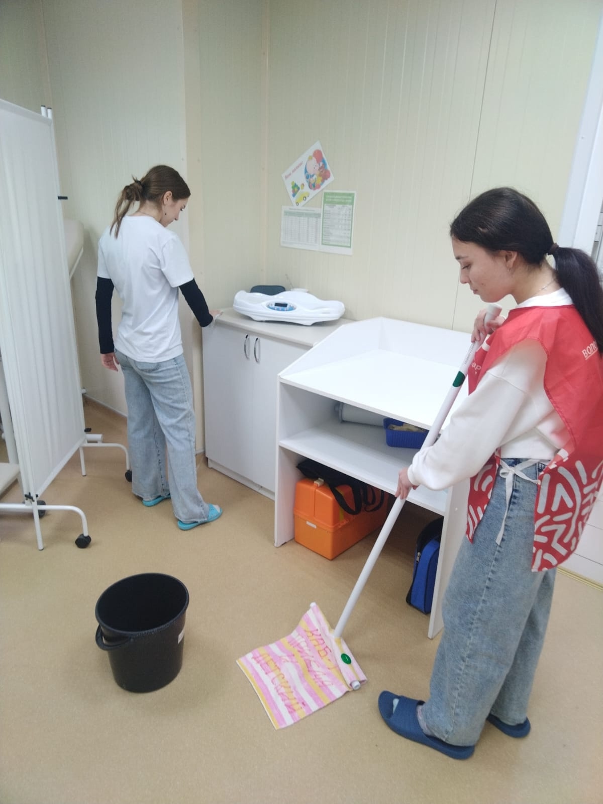 В завершение смены волонтеры проявили заботу о чистоте и гигиене медицинского учреждения, проведя влажную уборку помещений ФАПа.