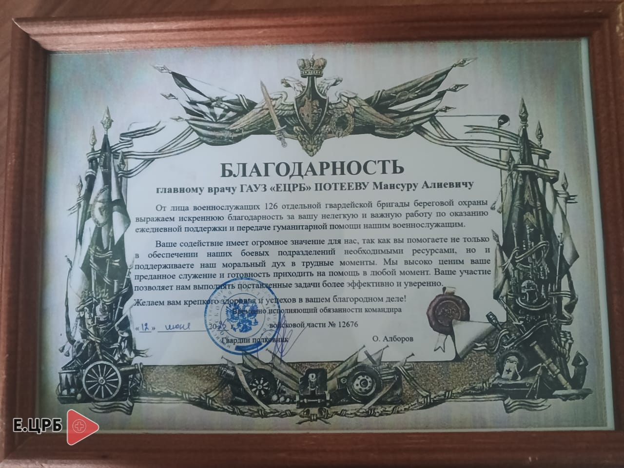 На имя главного врача Елабужской ЦРБ Мансура Потеева поступило Благодарственное письмо от 126 отдельной гвардейской бригады береговой охраны.