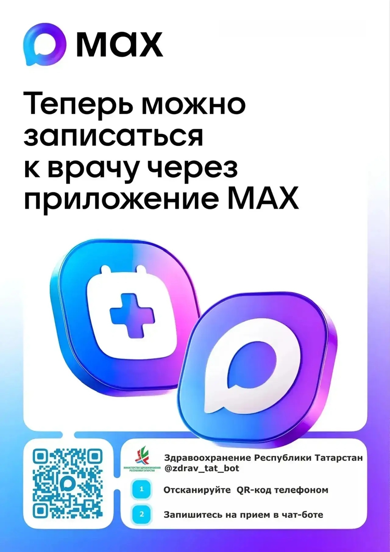 Ссылка на бот: max.ru/zdrav_tat_bot Просто отсканируйте QR-код с телефона и запишитесь на прием в чат-боте max.ru/zdrav_tat_bot